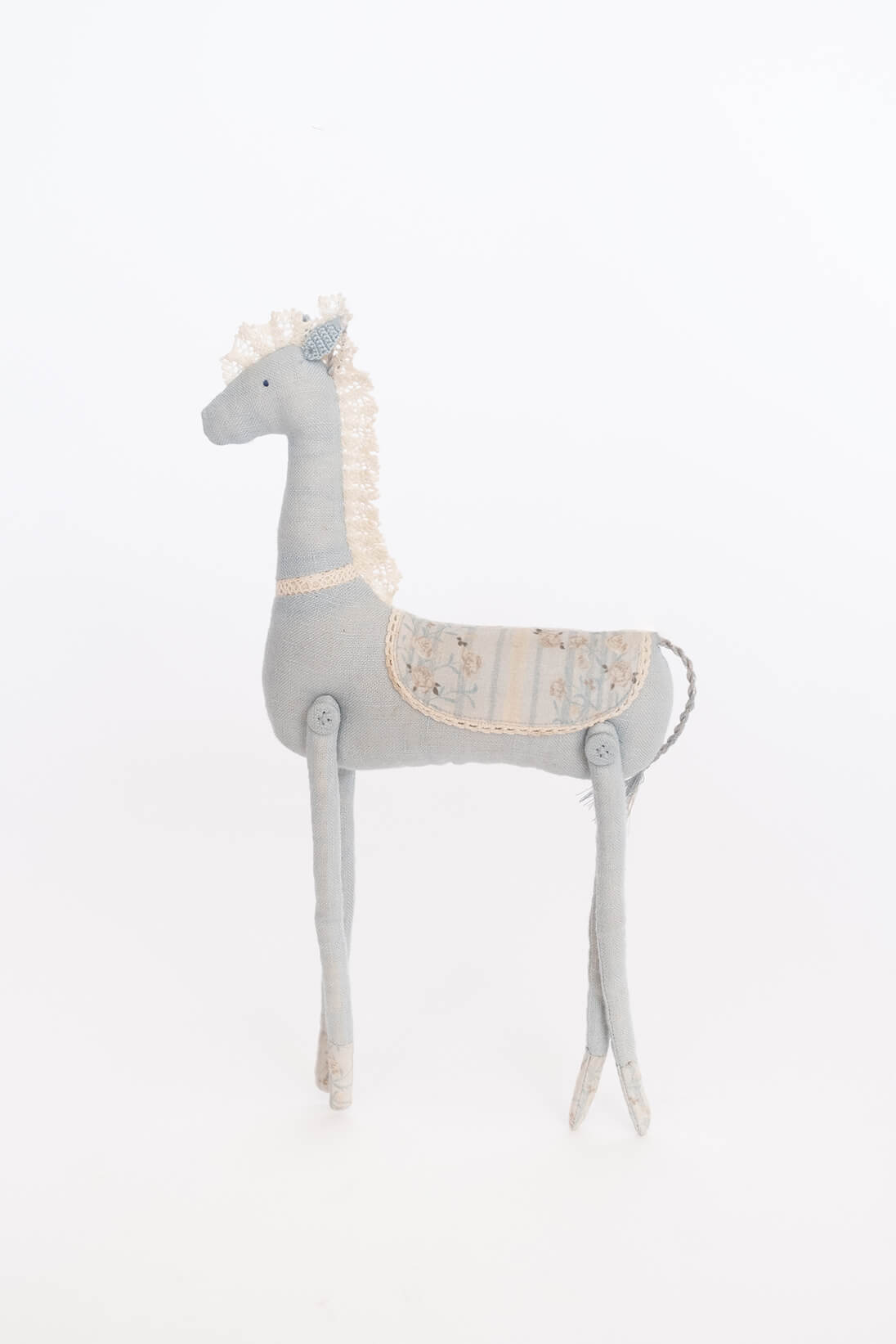 Blue pony with lace finishing and printed cotton saddle.Â