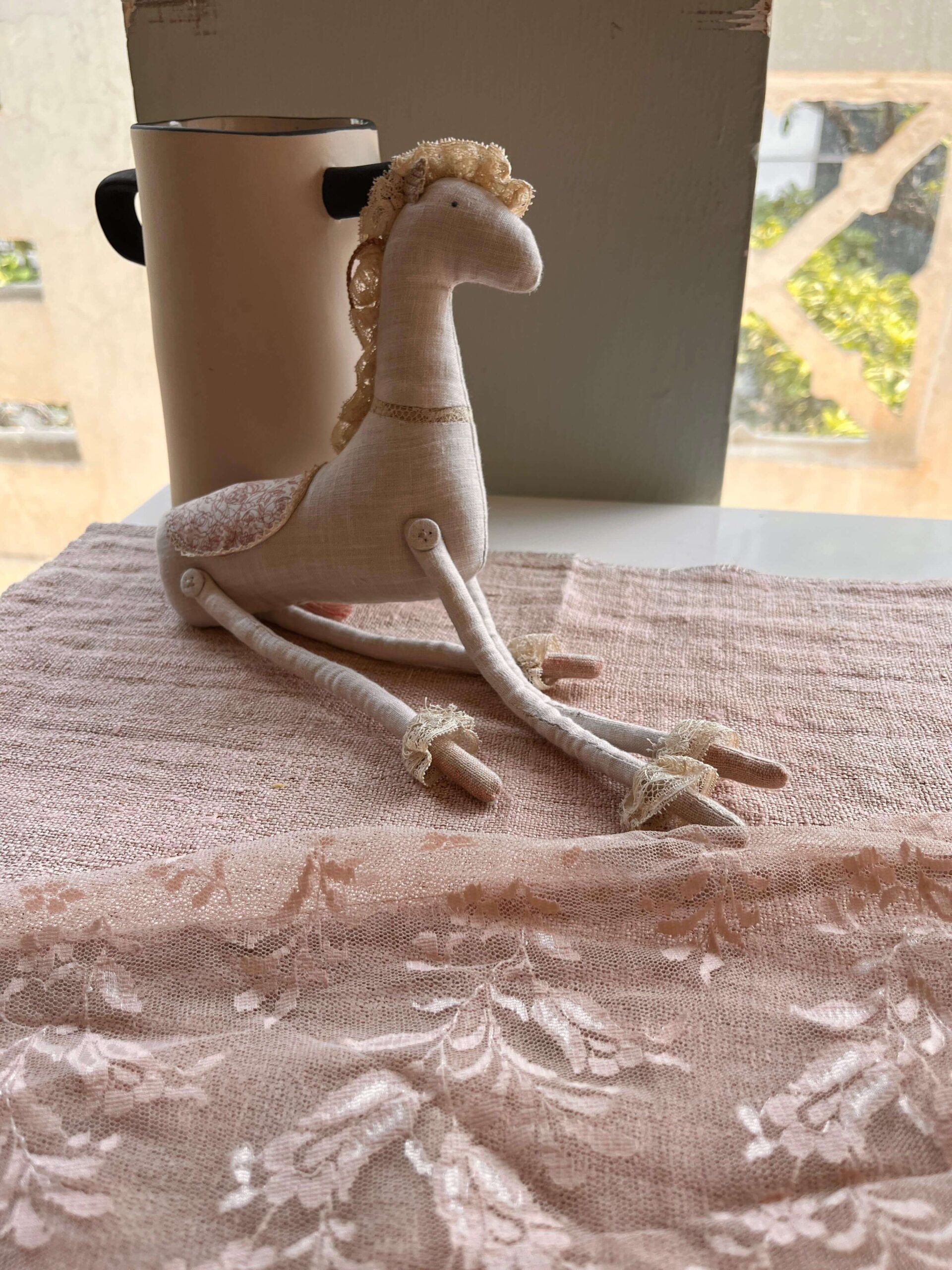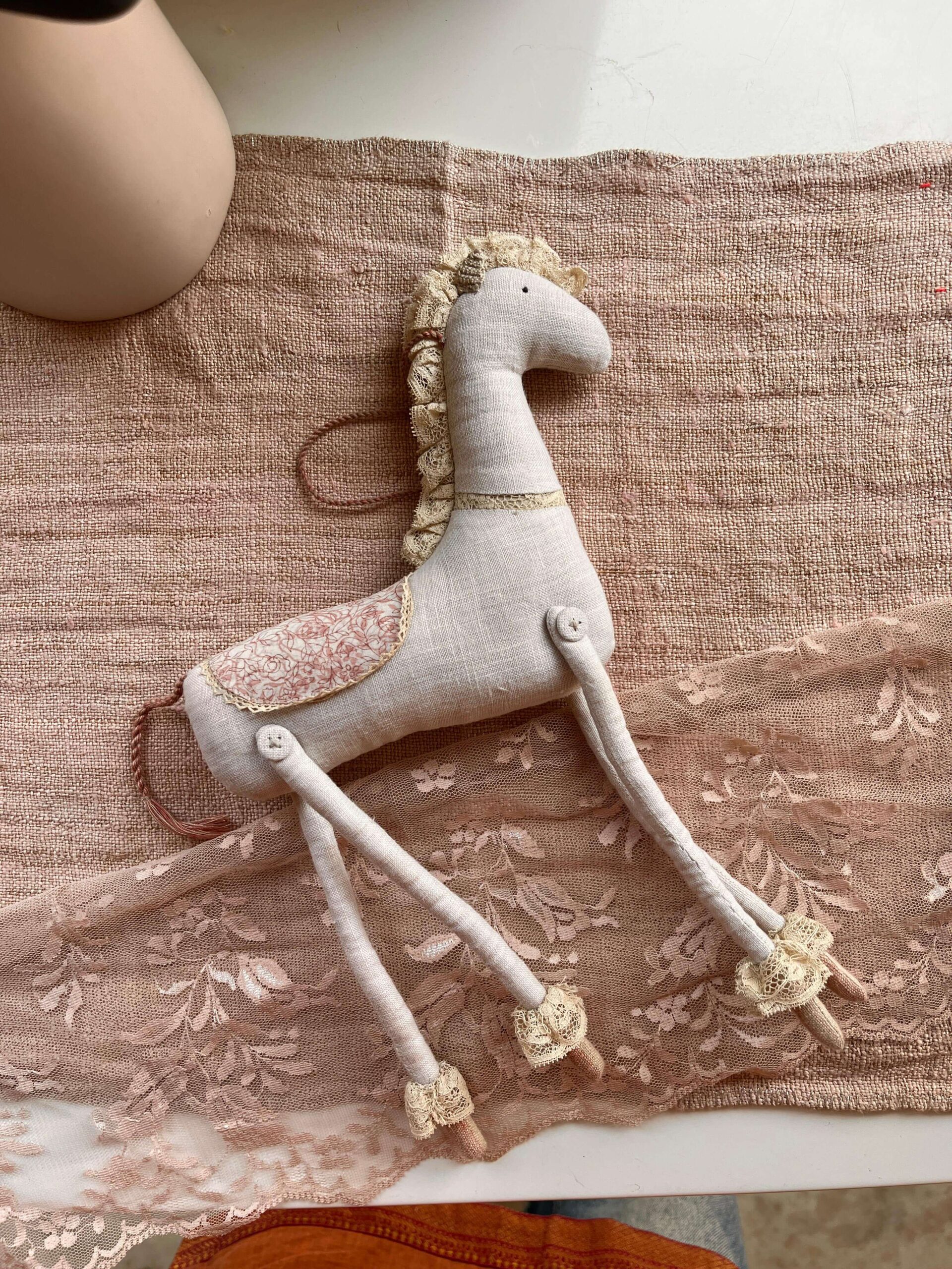 Pink horse with french lace finishing and block printed cotton saddle.